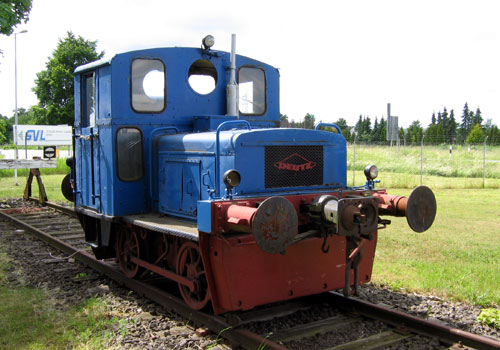 12.06.2005/ jm/ Von der Straße aus gut sichtbar steht hier eine blaue Deutz-Rangierlok, welche nicht den Eindruck macht, noch eingesetzt zu werden.