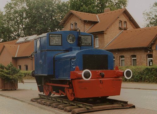 12.06.2004/ cp/ Hornburg lag an der Kleinbahnstrecke Börßüm – Wasserleben. Das Bahnhofsgelände wird heute von den Verkehrsbetrieben Bachstein als Busbahnhof genutzt. Auf einer Grünfläche steht eine kleine Deutz um an die Eisenbahn zu erinnern.