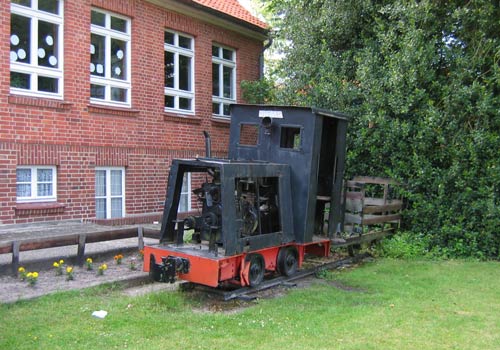 13.06.2005/ jm/ Vor der Schule steht eine Feldbahnlok mit MWM-Motor und Diema-Schriftzug am Führerhaus. Die Lok ist nicht ganz vollständig, die Identität ist nicht ganz klar.