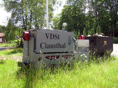 12.06.2004/ cp/ An der Hofeinfahrt zum Grundstück Altenauer Straße 9-13 in Clausthal-Zellerfeld steht eine Grubenlok als Denkmal (Nr. 5324).