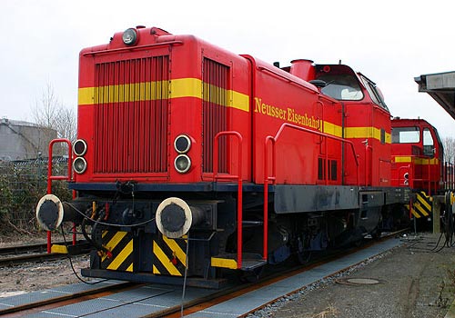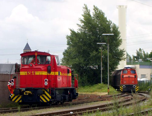 02.07.2004/ ha/ Die Neusser Eisenbahn (NE), Teil des Hafenbetriebs, hat den Betrieb in den Häfen beider Städte übernommen. Die beiden Hafenbahnen/Hafenbahnteile sind ja nur durch den Rhein und die Hammer Eisenbahnbrücke getrennt. Aus dieser Fusion der Neusser und Düsseldorfer Hafengesellschaften einschl. der beiden Hafenbahnen entstand die Neuss-Düsseldorfer Häfen GmbH & Co. KG. Angetroffen wurde beim heutigen Besuch die NE 4 und die Jung FNr. 14162, letztere ohne Beschriftung. Ebenfalls beim Rangieren angetroffen wurde die Rhenus Nr. 1 (O&K FNr. 26750/1972, Typ MC700N), die 2002 aus Berlin in Kraftwerk Lausward - wohl zur Aufarbeitung - kam.