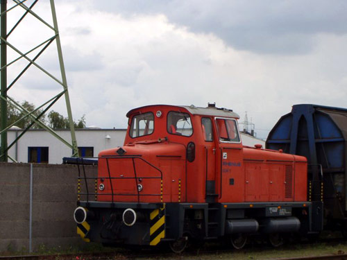 20.05.2005/ ha/ Die Henschel FNr. 31877 war am 15. April 2005 noch mit dem Brüninghaus-Firmenzeichen "Anker" und der Anschrift "Waggonbau Brünighaus Westhofen 1" vor der Werkstatt beim KW Lausward zu sehen. Drei Wochen später am 20. Mai 2005 war sie teilneulackiert (Brüninghaus-Zeichen und Anschrift überlackiert) mit neuer Frist als Leihlok bei der NE unterwegs.