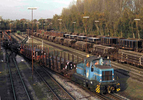 02.05.2002/ JR/ Der Werkbahnverkehr verteilt sich auf zwei Betriebsteile. Der eine liegt in der Nähe des S-Bhf Rath-Mitte der andere (evtl. auch nur Verschiebebahnhof) befindet sich entlang der Strecke nach Ratingen. Zwischen beiden Teilen finden häufig Übergabefahrten statt, die sowohl von der Brücke über die Liliencronstraße, aber auch vom Verbindungsgleis entlang der Theodorstraße bestens beobachtet und fotografiert werden können.