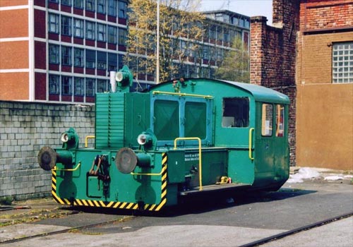 10.04.2002/ stw/ Direkt gegenüber von Max Goll, einem Schwertransportunternehmen, welches einige noch aus der Zeit kennen, als hier noch zwei Straßenbahnfahrzeuge standen, steht auf einem ehemaligen Firmengelände vor einer Werkshalle die ehemalige Köf der Duewag Düsseldorf: