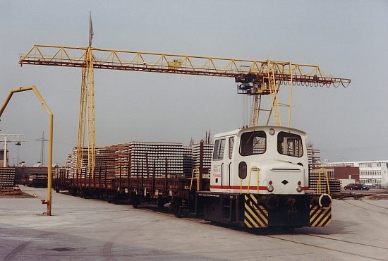 12.04.2003/ stw/ Hier befand sich deren weisse O&K FNr. 26202/1963 draussen. Eine weisse Köf II stand am Ende des Werkes, direkt an der Zufahrtstrasse zur TNT. Da das Unternehmen über zwei Köf II verfügt, könnte es sich um die abgestellte Gmeinder-Lok gehandelt haben.