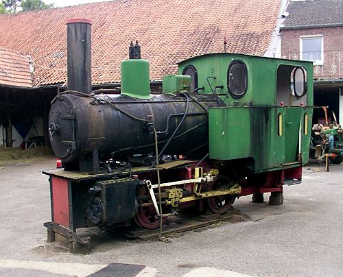 26.07.2003/ ms/ jm/ Im Hof des Anwesens Domagk steht seit den 1970er Jahren eine O&K-Feldbahndampflok. Sie wurde bis vor wenigen Jahren sogar zu besonderen Anlässen angeheizt und in Bewegung gesetzt - wobei die Lok selber auf Rollen steht und fest am Ort verharrt. Ursprünglich war sogar mal eine kleine Feldbahnstrecke geplant, Schienen waren dafür auch schon vorhanden, jedoch wurde der Plan letztendlich - auch im Hinblick auf die Sicherheit - nicht realiesiert. Der Dr. Domagk ist sich sicher, dass die Lok Baujahr 1927 ist und von der Zeche Sophia aus Hückelhoven stammt. Ein Fabrikschild ist leider nicht mehr vorhanden, dass wurde vor Jahren an einen bekannten Schildersammler und Verleger zum Nachguß ausgeliehen und kam nie wieder zurück. So bleiben eigentlich nur die Nummern an den Stangen und die geben, neben als Fabriknummer "unbrauchbaren" Angaben, u.a. die 13059 wieder. In der O&K-Liste ist für die 13059 auch als Verbleib "Privat, Domagk" eingetragen. Die Herkunft passt aber nicht und so bleiben bei der Fabriknummer von den Stangen einige Zweifel.