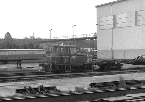 31.08.2005/ sk/ Zum Rangieren wird hier weiterhin die Lok 221 eingesetzt, welche heute zur Abwechslung mal in der Halle stand. Die Anschlußbedienung erfolgt durch Railion ab Dortmund-Obereving/Westerholz.