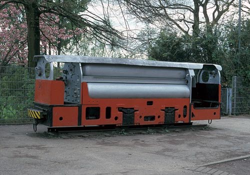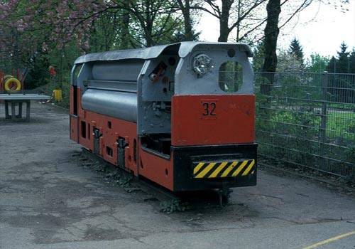 20.08.2006/ mw/ Eine Jung-Druckluftgrubenlok steht hier auf dem Spielplatz. Sie trägt die Nr. 32, hat ca. 530 mm Spurweite und es dürfte damit die Jung FNr. 12933/1958 sein.