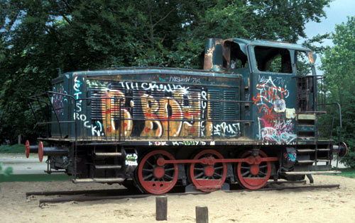 15.06.2003/ ms/ Die hier jahrelang aufgestellte Lok, ex Hafenbahn Essen (Krupp, Cdh), wurde im Frühjahr 2003 verschrottet, nachdem sich Kinder an der Lok beim Spielen verletzt hatten. Komisch, haben sich die Kinder etwa beim Graffitysprayen versehentlich Farbe ins Gesicht gesprüht?