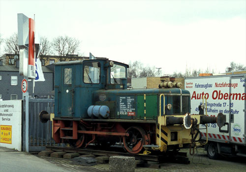 22.03.2007/ mw/ Bei dem Denkmal handelt es sich um die grüne Deutz FNr. 57797/64 (KS55B-ex laut Anschrift). Die Lok war problemlos an der Einfahrt des Werkes zu fotografieren. Eine Klappe an der Motorhaube war grün übermalt, man konnte aber noch die Schrift darunter erkennen: Wacker Chemie, Köln-Merkenich, Betriebs-Nr. 1.