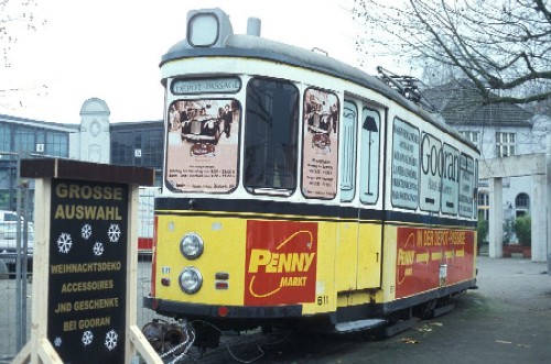 Denkmal: Der Tw 811 als Werbeträger in Mülheim. (Foto: 10.12.2008, Martin Welzel)