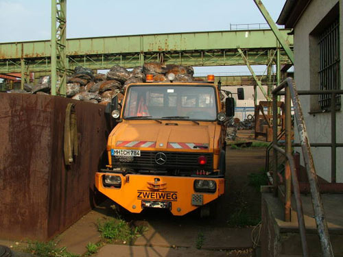 16.08.2002/ jm/ Die beiden alten Zweiege-Unimogs wurden durch ein neues modernes Fahrzeug aus dem Hause Zweiweg ersetzt. Dieser wird wechselweise zwischen den Werken I (Steineshoffweg) und dem Werk III am Nordhafen eingesetzt - je nachdem, wo gerade Rangierbewegungen zu erledigen sind.