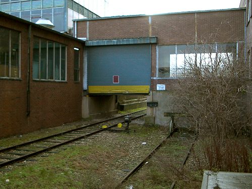 27.05.2002/ pz/ Der Anschluss dieses Werks weist eine Besonderheit auf: Die Gleise der Hafenbahn Wesel führen zwischen zwei Gebäuden hindurch, verbunden sind diese mit einer Hebebrücke über das Gleis. Hier hat sich eine der Hafenbahn-O&K´s auch schon mal beim Versuch, die geschlossene Hebebrücke zu unterqueren, die "Nase" plattgedrückt...