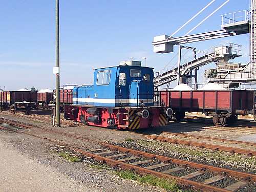 25.10.1999/ uv/ Unverändert läuft hier der Salzumschlag mit der blauen Lok 43 (Schöma 4831) und der sehenswerten Kranreihe. Am besten kann man nachmittags fotografieren. Die Solvay-Züge werden nur noch morgens und mittags angeliefert. Am Nachmittag wird am Hafen aber die Verladetätigkeit fortgesetzt.