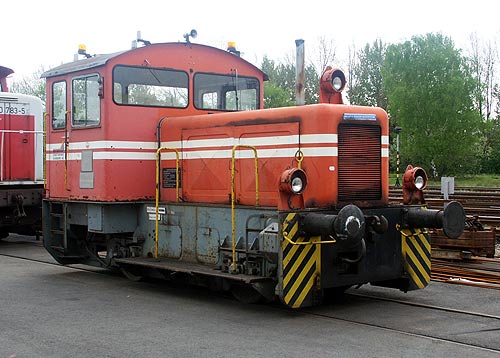 24.04.2004/ ms/ jm/ Vor dem Stellwerk stand die MaK G 761 C, vor der Halle die LEW V 100 BB alias 202 001. Neben der Halle wurde die Gmeinder vom Kraftwerk Walzenstraße, ein Windhoff-Schwerkleinwagen und die ehem. DB 360 783 angetroffen. Letztere hat einen Frontschaden, der schon etwas heftiger ist, da auch die Frontplatte des Rahmens geknickt wurde.