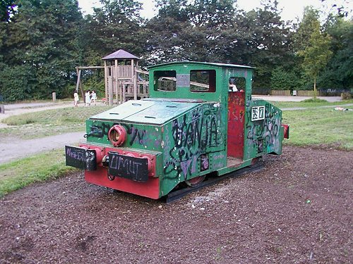 15.08.2002/ jm/ Eine "urige" Elok in grüner Lackierung steht hier auf dem Spielplatz. Sie trägt das Schild "ES 7" und das weist sie damit als eine der insgesamt sieben Eigenbau-Lokomotiven der Dortmunder August Thyssen Hütte aus. Diese Akku-Lokomotiven wurden 1930 gebaut und bis Anfang der 1960er Jahre eingesetzt. Die ES 1 gelangte auf einen Spielplatz in Duisburg-Homberg, also auf der andere Rheinseite ca. 5 km entfernt. Die ES 3 steht/stand auf einem Spielplatz in Moers-Kapellen, ebenfalls auf der anderen Rheinseite, rund 10 km entfernt. Die anderen fünf Maschinen sollen 1963 verschrottet worden sein. Da allerdings auch die hier vorgefundene ES 7 auf einem Spielplatz überlebt hat, würde es mich nicht wundern, wenn auch die anderen Maschinen auf einem Spielplatz endeten. Der Spielplatz ist in den letzten Jahren modernisiert worden, die alte Lok hat das überlebt. Gibt es die anderen beiden Maschinen eigentlich noch?!