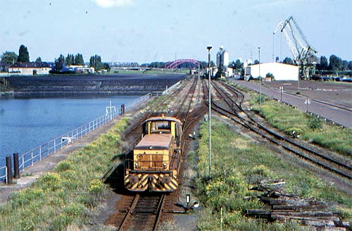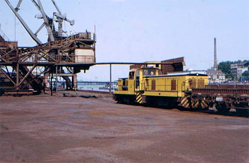 17.02.2004-info/ fg (NS, PWP, fg, 09.09.1995, GM, 02.07.2000, fg 23.07.2000, fg, 12.04.2003, fg 21.07.2003, JaS, MK, s.a. DS 53, S. 60, DS 55, S. 60, DS 59, S. 64, DS 84, S. 74, DS 112, S. 78, DS 147, DS 168)/ Auf der Speditionsinsel am Beginn des Ruhrorter Hafens betrieb die Fa. Cargotrans jahrelang einen Schiff/Bahn-Erzumschlag. Umfangreiche Krananlagen waren in Betrieb, große Halden von sog. Erz-Pellets prägten das Bild. Die beladenen Erzwagen (Fals u.ä.) wurden von DB-Loks der Reihe 290 abgeholt. Ende der 1990er Jahre wurde der Betrieb jedoch eingestellt und das Gelände zusehends abgeräumt. Teile des Hafenbecken "Hafenmund", der Vinckekanal und der Kaiserhafen wurden mit Bergematerial aus dem Ruhr-Bergbau zugeschüttet.