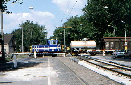 16.02.2006/ sk/ Leider sit der Schrankenposten vor einigen Monaten aufgelassen und durch eine automatische Schrankenanlage ersetzt worden, um die Übergabe zu "erwischen", benötigt man daher jetzt vor allem Geduld, heute war es erst gegen 12.45 Uhr soweit. Im Einsatz befindet sich weiterhin die Schöma, die heute sechs Wagen zum DB-Bahnhof zog und alleine zurückfuhr.