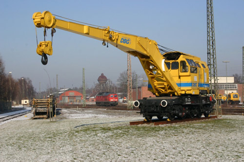 DB Bahnbau: Als Denkmal steht dieser Schienenkran vor dem Werk. (Foto: 28.01.2006, Jürgen Utecht)