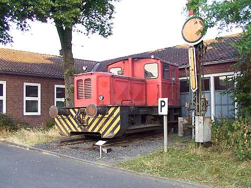 26.06.2001/ jm/ Beim Bahnhof steht eine rote Deutz als Denkmal, die vor zwei Jahren noch als Werklok bei Solvay in Rheinberg-Both diente (ex. Dortmund-Hörder-Hütten-Union AG DHHU, Dortmund-Hörde, für Werk Hörde (37) -> (127) /1967 Deutsche Solvay, Rheinberg-Both (8) -> (10); 1998, 01.1999 vh/ 29.05.1999 Denkmal, Kevelaerer Eisenbahn & Modellbahnfreunde e.V., Bf Kevelaer)