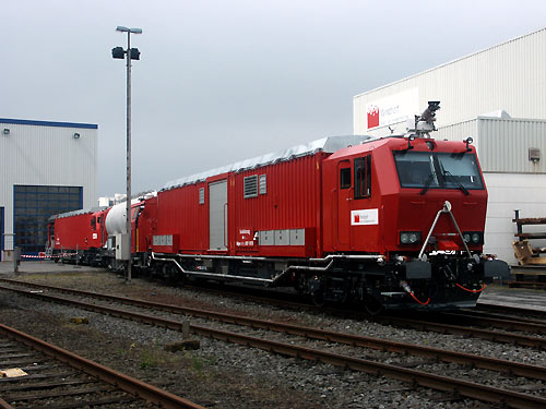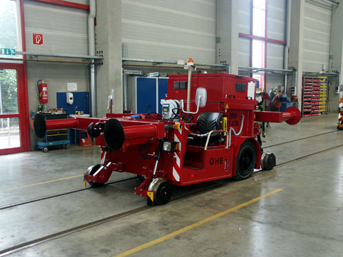 04.06.2004/ jm/ Hier wurde heute 115 Jahre Windhoff gefeiert und dabei der neue Lösch- und Rettungszug für die Schweiz vorgestellt. Das neue Fahrzeug bassiert auf dem MPV, der den meisten als Cargo-Sprinter der DB bekannt sein dürfte. Hinter dem MVP steckt aber mehr als nur ein "Container-Shuttle", es dient mittlerweile als Trägerfahrzeug für diverse Aufgaben: Fahrweg-Instandhaltung und Trassenbau, Fahrdrahtverlegung, Gleis- und Fahrdraht-Kontrolle, Gleis , Fracht-Transport und als neuste Entwicklung der Lösch- und Rettungszug. Der neue Triebzug entstand in Zusammenarbeit mit der Dräger AG (Schweiz) und der Joseph Meyer Waggon AG. Er besteht aus einem Gerätefahrzeug, einem Tank-/Löschwagen und dem Rettungsfahrzeug(en). Im Einsatz wird der Zug bis an die Unfallstelle gefahren. Während dort die ersten beiden Fahrzeuge (die Löscheinheit) die Brandbekämpfung aufnehmen, kann das/die Rettungsfahrzeug(e - die Rettungseinheit) abgekuppelt werden und so zwischen Unfallstelle und Tunnelausgang pendeln, um Personen schnellstmöglich aus dem Tunnel heraus zu bringen. Die Fahrerkabinen wie auch die Rettungsfahrzeuge stehen unter Überdurck, so dass kein Rauch eindringen kann und das Tragen von schweren Atemschutzgeräten innerhalb der Fahrzeuge nicht notwendig ist. Der zukünftige Einsatzort wird die neuen Alpentransversale (der Lötschberg Basistunnel) sein.