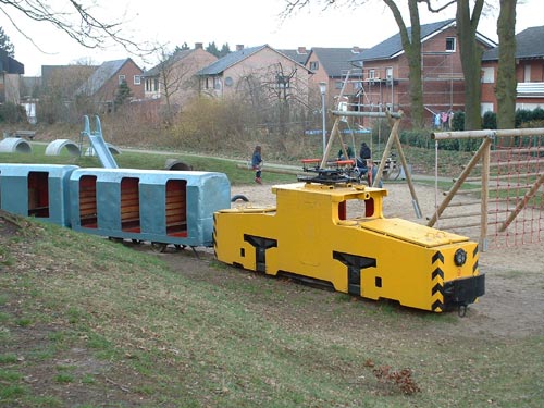 25.03.2005/ uv/ Auf dem Spielplatz befindet sich ein kleiner Denkmal- bzw. Spielzug, der seine Vergangenheit bei der Preussag in Ibbenbüren nicht leugnen kann. Der Zug ist in einem erstaulich guten Zustand und wurde offensichtlich erst vor kurzer Zeit restauriert. Die Lok trägt die Betriebsnummer 9. Der Stromabnehmer dürfte allerdings von einer anderen Fahrleitungslok stammen.