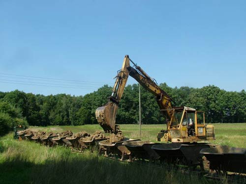 29.08.2005/ sk/ Und tatsächlich, die Auskunft stimmte, die Feldbahn war heute tatsächlich in Betrieb! Da seit Mai 05 nichts mehr gefahren war, war die Gleisanlage entsprechend verkrautet und zugewuchert, und auch mit dem Bagger gab es scheinbar ein paar Probleme, sodaß die Diema sogar alleine auf "Werkstattfahrt" auf der Strecke beobachtet werden konnte. Gegen Mittag waren dann alle Probleme ausgeräumt, die Beladung der 14 Loren konnte beginnen. Dank der stark zugewucherten und nicht ganz ebenen Strecke war die Fahrt mit dem beladenen Zug von der Grube ins Werk dann recht abenteuerlich und dauerte weit über eine Stunde - bei einer Streckenlänge von nur etwa 2 km!