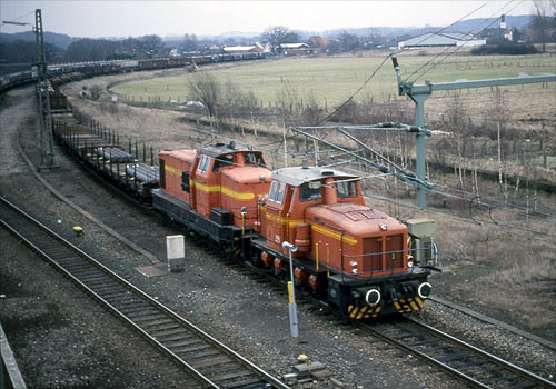 Georgsmarienhütte: Lok Nr. 2 (Deutz FNr. 57802) und Nr. 4 (Deutz FNr. 57804) mit einem Kokszug zur Hütte bei Holzhausen. (Foto: 05.09.1989, Gerd Hahn)