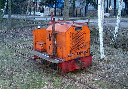 11.06.1994/ 20.06.1994/ 26.06.1994/ uv/ Hinter dem Torfwerk Wübbeler ist kürzlich "Das Haus im Moor" entstanden, ein Naturschutz-Informationszentrum, welches das Leben im Moor dokumentiert. Daran angeschlossen ist auch ein Lehrpfad durch abgetorftes, wiedervernäßtes Moor. Dem Besucher werden weiterhin Moorbahnfahrten angeboten. Dafür stehen eine orange Diema-Lok und vier unterschiedliche Personenwagen zur Verfügung. An Wochenenden wird so mehrmals täglich ins Moor gefahren und dort Leben und Vegetation erläutert. Nach Voranmeldung finden solche Fahrten auch an Wochentagen statt. Bisweilen werden ganze "Busladungen" durch "Das Haus im Moor" geschleust, das auch im Umland durch reichlich Radfahrwegweiser ausgeschildert ist. Leider hatten wir heute nicht die Gelegenheit zur Besichtigung des Informationszentrums.