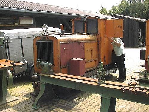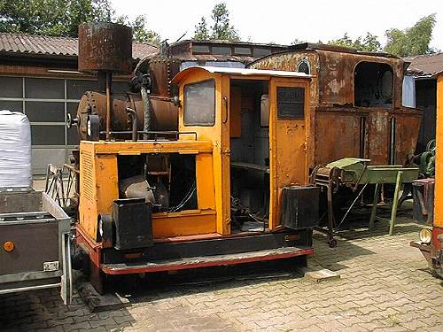 22.08.2004/ happi/ Die Betriebslok ist tatsächlich Schöma FNr. 2024, auf die Kuhfuss-Vergangenheit deuten auch die Druckanschlüsse am Führerhaus hin. Die etwa drei Kilometer lange Rundstrecke durch’s Moor ist Betrieb und wird um 14.00h, 15.00h und 16.00h befahren. Dauer – wegen der niedrigen Geschwindigkeit - ca 30 Minuten. Die Reihen haben sich scheinbar etwas gelichtet: Zu sehen waren die beiden Loks in der Ausstellung, die dicke DS90 am Eingang, die schwarze FNr. 2024 im Dienst, die beiden schon im Archiv abgebildeten offenen Loks (Reserve), die Dampflok (O-Ton des Lokführers: "Schrotthaufen") und eine im erweiterten Freigelände aufgestellte Lok (siehe Bild unten, ich meine Klasmann 34). Der alte Deutzer im alten Freigelände ist auch noch da.