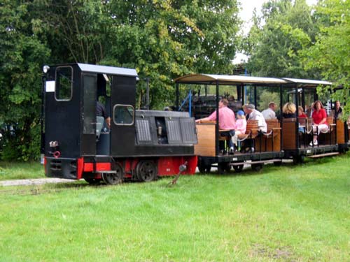 05.07.2002/ dr/ Seit dem letzten Besuch am 30. April 2001 hat sich einiges verändert. Zwei Lokomotiven (Schöma 1419/1952 und Diema 1047/1940 ?) wurden vom Klasmann-Werk in Groß Hesepe übernommen. Vom Münsterländischen Feldbahnmuseum in Rheine hat man im Tausch gegen Schöma 357/1938 (LO40) eine andere, neuere Schöma (evtl. 2720/1964 ?) erhalten. Diese wird nun vor dem Personenzug, der aus umgebauten Bundeswehr-Wagen besteht, eingesetzt.