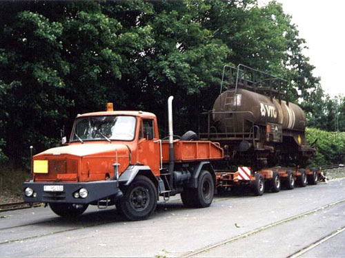 Hagedorn: Das Gespann bestehend aus Faun-Zugmaschine und Straßenroller mit Kesselwagen an der Laderampe am Bahnhof Lingen. (Foto: 11.09.2001, Stefan Kunzmann)