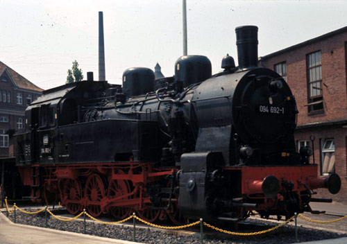 22.11.1972/ mw/ Am 22.11.1972 durften wir leider nicht hinein, um die mit Nietziffern als "094 492-1" beschriftete Denkmalslok (094 692-1) zu fotografieren. Es blieb nur der Schuss durchs Werkstor, und das bei miesem Wetter. Nach einem kurzen Schreiben an das AW (wegen der falschen Loknummer) wurde der Fehler behoben. Am 27.Juni 1973 konnten wir die nunmehr richtig beschriftete Lok nochmals aufnehmen. Die Nietschilder hatte die Lok behalten.
