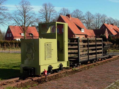 17.10.2004-info/ pz/ Eine Feldbahnlokomotive mit Torfloren wurde als Denkmal aufgestellt. Die Lok stammt vermutlich vom Torfwerk Dues. Nähere Daten sind bisher nicht bekannt.
