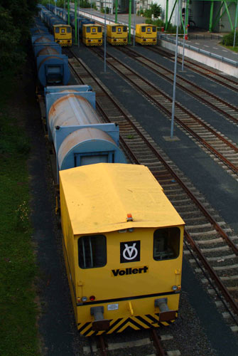 23.07.2005/ jw/ Die fünf Vollert-Verschubgeräte standen regungslos auf ihren Gleisen. An den Vollert-Fahrzeugen ist kein Schild mit Fabrik-Nr. und Baujahr angebracht, laut Vollert haben die Fahrzeuge die FNr. 96/035-1 bis -4 und 97/028.