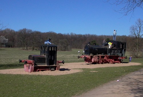 Spielplatz, Buschweg: Gleich zwei Lokomotiven stehen hier als Spielgerät. (Foto: Peter Ziegenfuß)