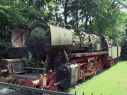 Der excellent gepflegte Rasen steht im scharfen Kontrast zur vergammelnden Dampflok. Auf dem Foto vielleicht erkennbar: aus der Oberflächenvorwärmernische wächst ein kleines Bäumchen, und der Grünspan auf der Lok wird immer grüner. Eisenbahnvereine, nehmt die Lok in eure Obhut!