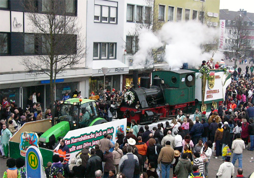 18.02.2007/ mk/ Am Sonntag den 18.2.2007 ging durch Düren der Karnevalszug. Der Karnevalsprinz Hans Peter II war der Eisenbahner und Geschäftsführer der Rurtalbahn Hans Peter Nießen. Als Prinzenwagen hatte er sich etwas ganz besonderes ausgedacht. Er hatte eine normalspurige Dampflokomotive Krauss FNr. 7899/1921 auf einen Tieflader montieren lassen. Während des Umzuges stand die Lok unter Dampf und das Läutwerk und die Pfeife wurden ständig betätigt. Um die Rauchbelästigung klein zu halten wurde mit Holz geheizt.