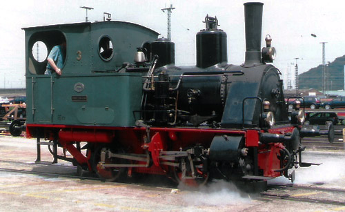 Bei der Dampfok handelt es sich um die Krauss FNr. 7899/1921, eine Bn2t, Normalspur. Sie stammt ursprünglich von der Chemische Fabrik Uetikon (CH) "3", ab 1948 Escher Wyss + Co (CH). Die Lok steht heute beim Institut für Schienenfahrzeuge der TH Aachen in der Institut-Versuchhalle. Das Institut befindet sich direkt neben dem Bahnsteig des Bf Aachen-West. Die betriebsfähige Lok in einem optischen Top-Zustand.