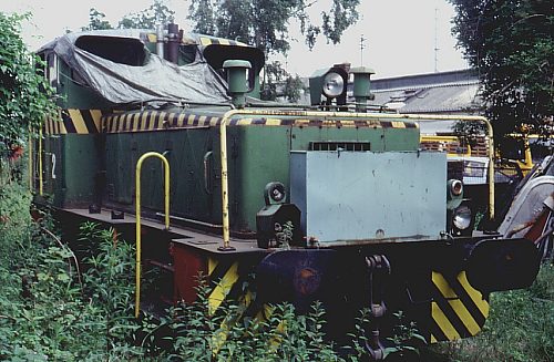 12.06.1999/ jm/ Etwas versteckt steht auf einem nicht mehr genutzten Anschlußgleis eine Krupp-Diesellok. Diese war einst beim Mannesmann-Röhrenwerk Düsseldorf-Lierenfeld als Lok 2 im Einsatz. Heute gehört sie einem Privatmann aus Köln. Neben großen Puffern ist die Lok auch mit einer Spurkranzschmierung ausgerüstet.