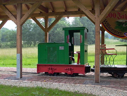 01.06.2003/ pz/ Die Denkmallokomotive steht weiterhin unter eine Überdachung am Ortseingang mit zahlreichen für den Weinbergbau spezifischen Wagen.