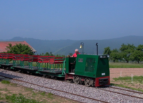 01.06.2003/ pz/ Eine Kurztour von zwei Tagen ermöglichte auch einen Besuch in Serrig. Die Denkmallokomotive steht weiterhin unter eine Überdachung am Ortseingang mit zahlreichen für den Weinbergbau spezifischen Wagen. Bei den Feldbahnfreunden fand an diesem Tag Fahrbetrieb statt. Die Feldbahnfreunde haben einen neuen Rundkurs errichtet und ein schönes Betriebsgebäude mit Lokschuppen ist entstanden. Sachkundig werden den Besuchern an den Haltepunkten Schweinestall, Kuhstall und Weinbergaussicht Details zum früheren Geschehen wie auch zur heutigen Abwicklung des Betriebes erläutert. Beim Haltepunkt Weinbergaussicht ist noch die ehemalige Werkstätte zu erkennen. Ab dort sollen noch die Schienen der ehemaligen Weinbergbahn liegen.