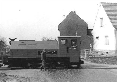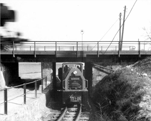 Bonner Portlandcement: Und so sah es hier rund 50 Jahre früher an der Unterführung aus. Die Aufnahme zeigt eine der beiden Ruhrthaler-Lokomotiven, die 1956 geliefert wurden. (Foto: Strunk - Archiv Ruhrthaler)