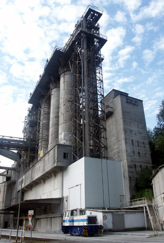 Schäfer Kalk: Gmeinder FNr. 5254/1963 vor der beeindruckenden Kalkwerkanlage. (Foto: Jens Merte)