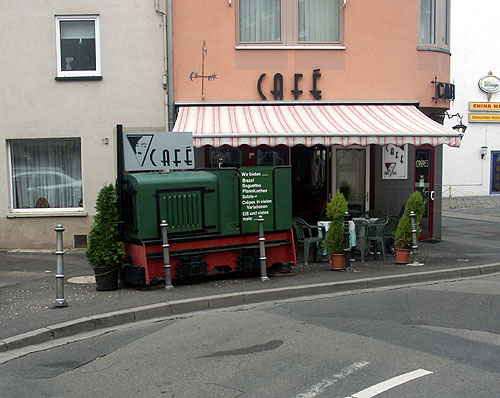 03.07.2006/ heg/ Seit Ende 2005 steht die Lok nicht mehr in der Hospitalgasse, sie ging zurück an die Sammlung in Bad Kreuznach. Das Café heißt heute Café ZeitGeist.
