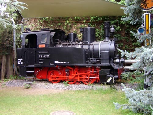 25.07.2004/ jm/ Im Garten des Verwaltung steht, von der Straße aus sichtbar, jedoch nicht gut fotografierbar, immer noch die 750 mm - C-n2t-Dampflok als Denkmal.