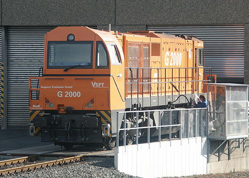 Wann das Gleis frei gegeben wird, weiß ich noch nicht. Da die Siegener Kreisbahn den Regional-Güterverkehr zwischen Siegen und Kreuztal übernommen hat und auch immer mal wieder die SK-Lok Nr. 41 im Fuchs-Werk selbst Wagen abholt, kann man mal davon ausgehen, daß die Siegener Kreisbahn auch das neue Anschlußgleis bedienen wird. Die Nr. 41 (MaK FNr. 1000832, Baujahr 1988, ex. Hersfelder Eisenbahn) wurde - wie fast täglich - auch heute im Einsatz gesehen, und zwar beim Rangieren im Bahnhof Weidenau.