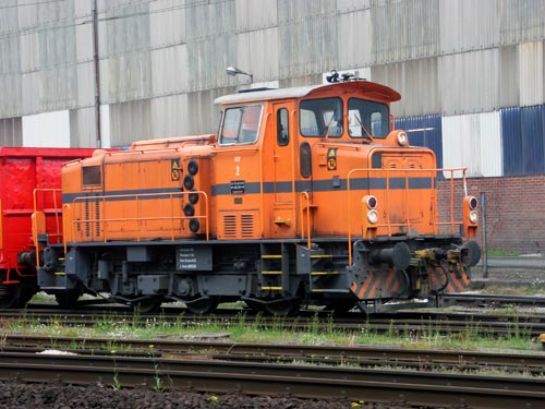 12.05.2004/ jm/ Auf dem Schrottplatz wurde (mal wieder) die Drehgestellok Nr. 7 im Einsatz. Beim Bahnhof Geisweid wurde die Nr. 4 (blau) von der Hauptstraße aus gesichtet, sie war jedoch bereits beim EIntreffen auf dem Parkplatz verschwunden. Dafür begann nun die Nr. 2 (orange, 60 t Dienstgewicht, HU 20.12.2002) hier mit dem Rangieren und wurde dabei dann abgelichtet. Da die Nr. 5 letztes Jahr über VSFT Moers in die Niederlande gelangte (und mir keine Meldung über einen Ersatz vorliegen), wurde so innerhalb von wenigen Minuten der gesammte aktuelle Bestand erfasst.