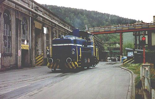 24.04.1998/ jm/ Wie bei allen großen Stahlwerken (hier sind 1200 Mann beschäftigt) gibt es ein umfangreiches Gleisnetz und mehrer Werklokomotiven. Zum Schichtwechsel konnten, da der Besuch vorher angemeldet wurde, die drei im Einsatz befindlichen Lokomotiven Nr. 4 (blau), Nr. 5 (orange) und Nr. 7 bei der Werkstatt auf dem Krupp-Gelände abgelichtet werden. In der Werkstatt stand die Nr. 2 (blau).