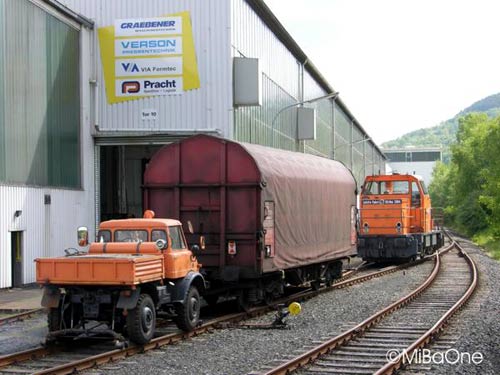 31.05.2002/ jm/ Am Ende der ehemaligen Kleinbahn Weidenau-Deuz in Werthenbach liegt das Gräbener-Werk. Einst führte die Bahn noch weiter bis in den Ort, dieses Streckenstück wurde aber in den 1980er Jahren abgebaut. Als Verschubfahrzeug dient ein Zweiwege-Unimog älterer Bauart (runde Haube), welches auch heute gesichtet wurde. Es wird weiterhin eingesetzt, da immer noch Wagen per Bahn zugestellt werden.
